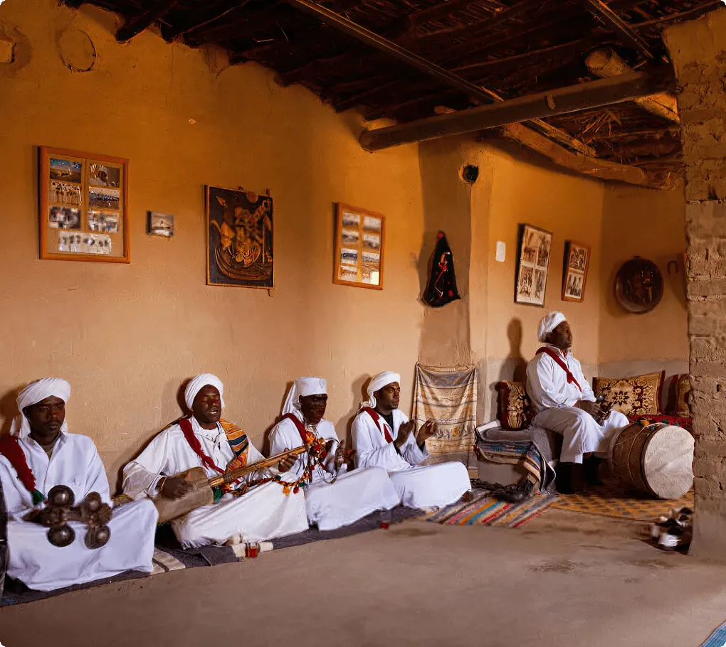 After breakfast, we set out on foot to visit the nomads. We enjoy lunch with them and gain insight into their traditional lifestyle and customs. Afterwards, we head to the Lgrizima Oasis, surrounded by palm trees, and participate in preparing traditional desert bread. We spend the night at the oasis, enjoying the calm and natural setting.