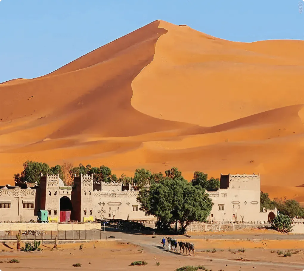 You cross the Atlas Mountains, visit Ait Ben Haddou, pass through Ouarzazate and the Draa Valley, and continue toward the Sahara through villages such as Nkob, Alnif, Tafraoute Sidi Ali, and Ramlia. In Merzouga, you experience the Erg Chebbi dunes with a camel trek and an overnight stay in a luxury desert camp, before returning via Rissani, Todra Gorges, and the Dades Valley back to Marrakech.